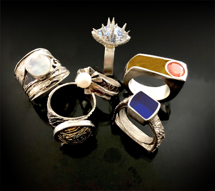 Join us to develop or advance your ring making skills with sterling and fine silver clays. Projects will include open, round, flat band and hollow ring forms, ring sizing, nonfireable gemstone setting, pearl setting, stone/opal inlay, a carved customized gem setting, firing and finishing. A materials fee of $40.00 is payable TO THE INSTRUCTOR at the first session. The $40 materials fee for this class includes, a fine silver bezel setting, choice of opal or stone inlay, use of instructor provided tools and equipment, and other consumables used in class. It does not include any metal clay products, fireable gems, stone cabochon or pearls.